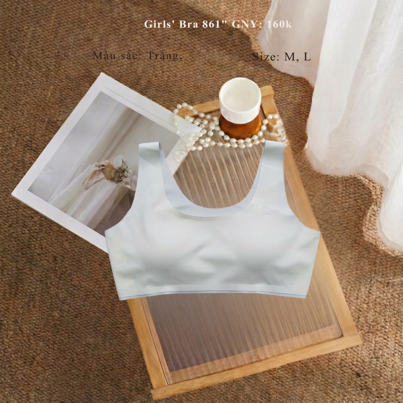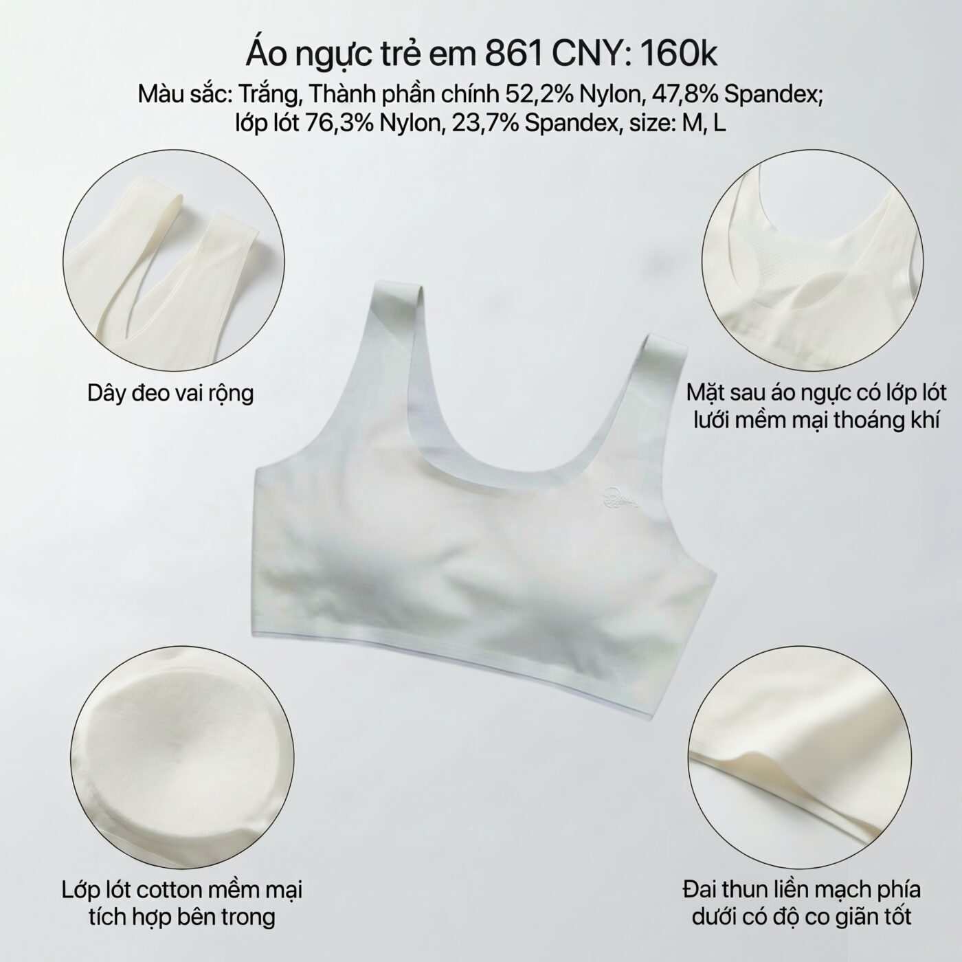 Áo lót bé gái 861 ( áo lót lá học sinh) không đường may chính là "vũ khí bí mật" giúp các bé luôn tự tin, thoải mái khi tới trường! 😍 🌿 Thiết kế không gọng thông minh kết hợp mút mỏng nhẹ (0.5cm), ôm ấp nhẹ nhàng và định hình form dáng tự nhiên mà không lo bị lộ viền. ✨ 🌸 Chất liệu su mịn siêu mềm mại, thoáng khí, "mặc như không mặc", tha hồ vận động cả ngày dài năng động! 💃 📏 Đầy đủ size M, L phù hợp cho các bé giai đoạn mới dậy thì, với sắc màu Trắng thanh lịch, phù hợp với mọi trang phục đi học. 🎀 💰 Siêu phẩm chất lượng, mỏng nhẹ yêu chiều làn da bé